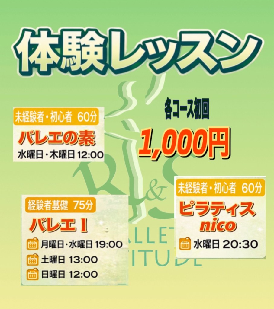 バレエの素・バレエⅠ・ピラティスnico それぞれ初回のみ1,000円で体験レッスンできます。